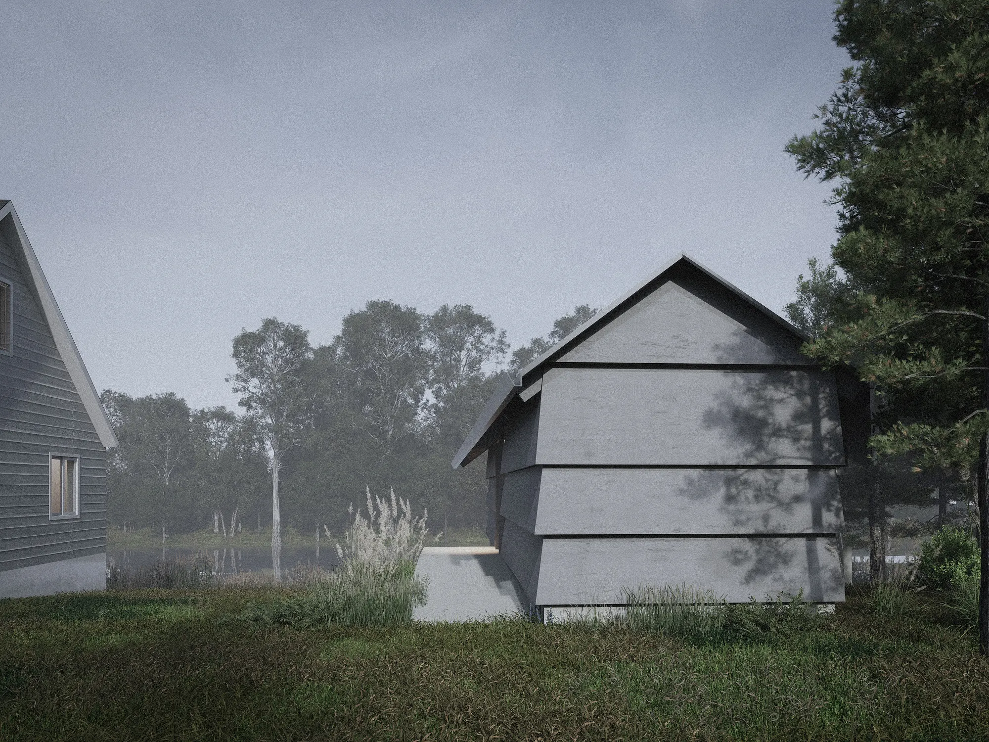 Bounded by a street-side ridge and a wetland-lined riverbank, the site offered both a challenge and an opportunity. A steep grade descends from the road to the water’s edge, where seasonal flooding and sensitive riparian zones mandated a careful footprint. We responded with an elevated, wedge-shaped volume, lifting living spaces above flood risk and pulling back from the wetlands to preserve the river’s natural ecology.