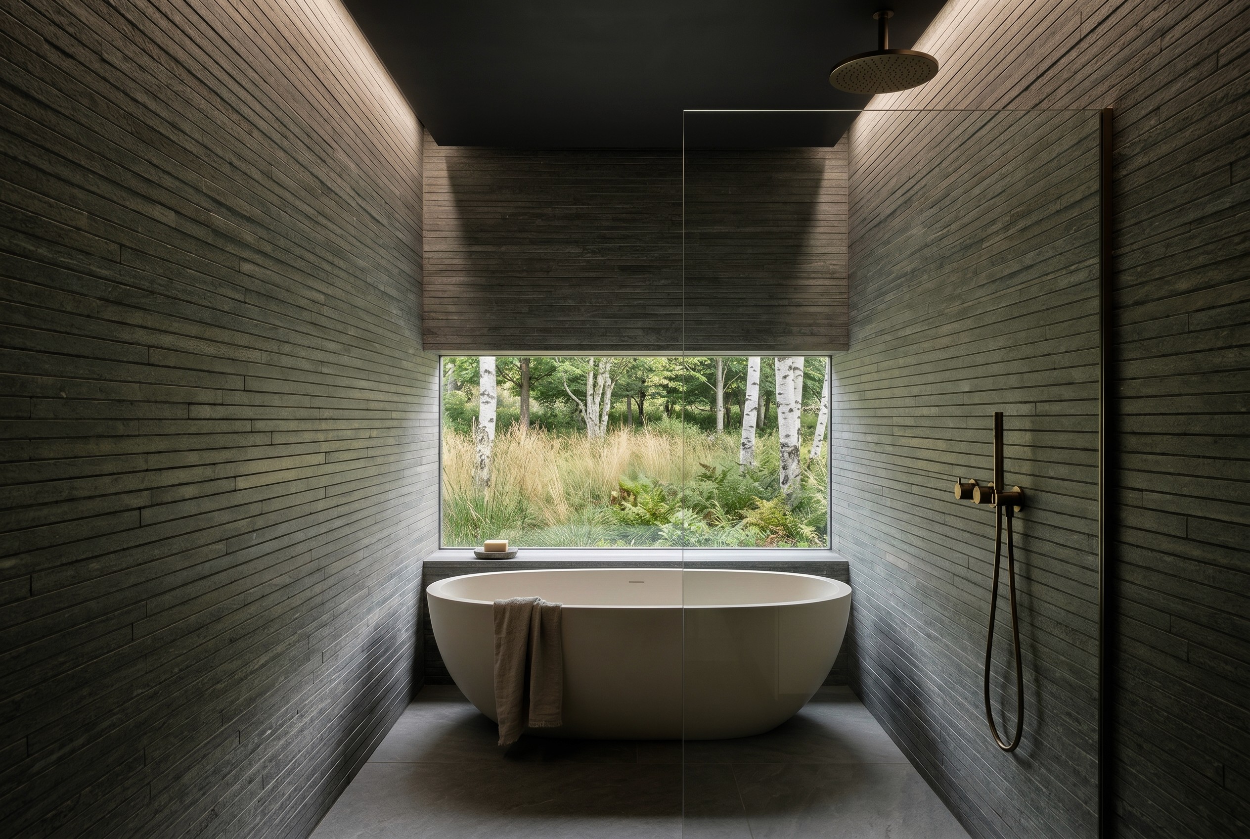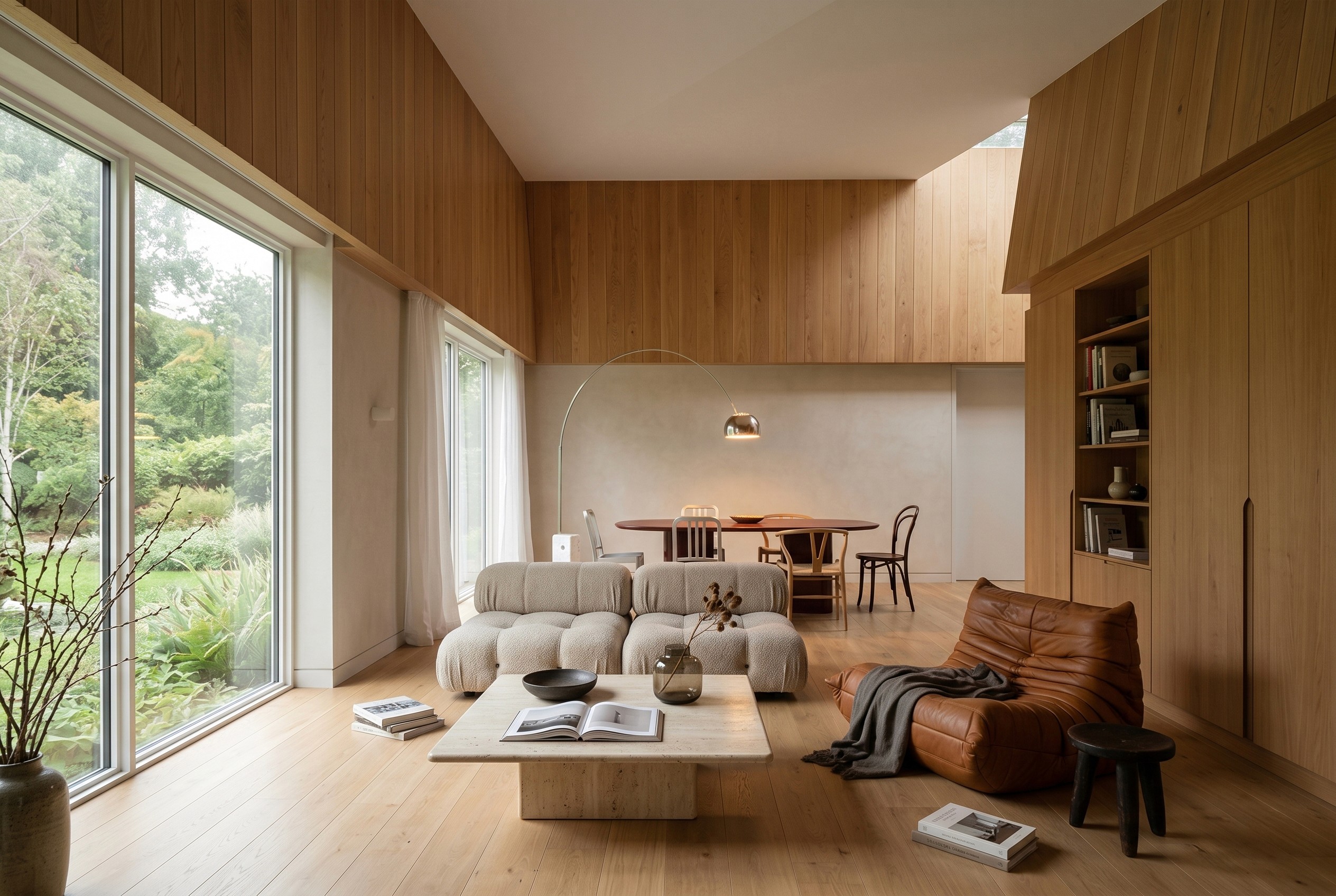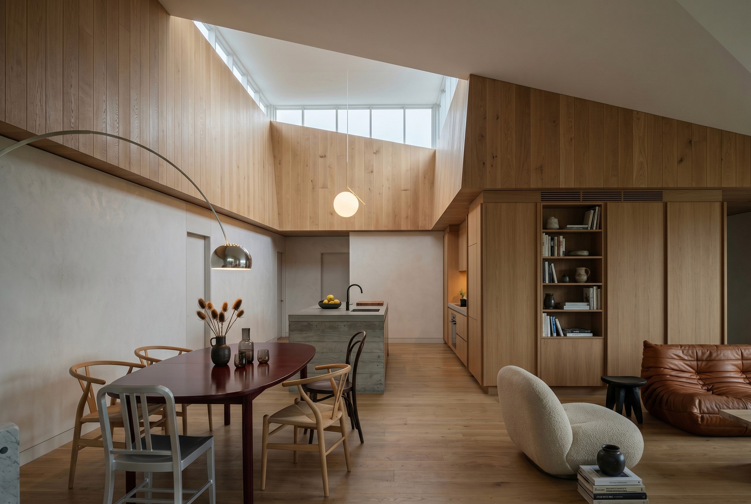 A continuous slanted wood-paneled fascia wraps the interior perimeter, establishing a datum line that mediates between wall and ceiling. Practically, it conceals spot lighting, curtain tracks, and mechanical distribution. Materially, it belongs to a restrained palette of natural finishes — white oak paneling, lime plaster — that let the architecture recede and the light do the work.
