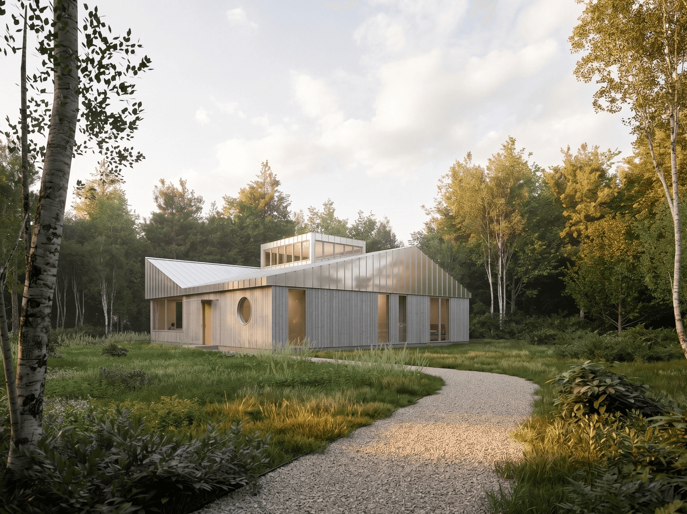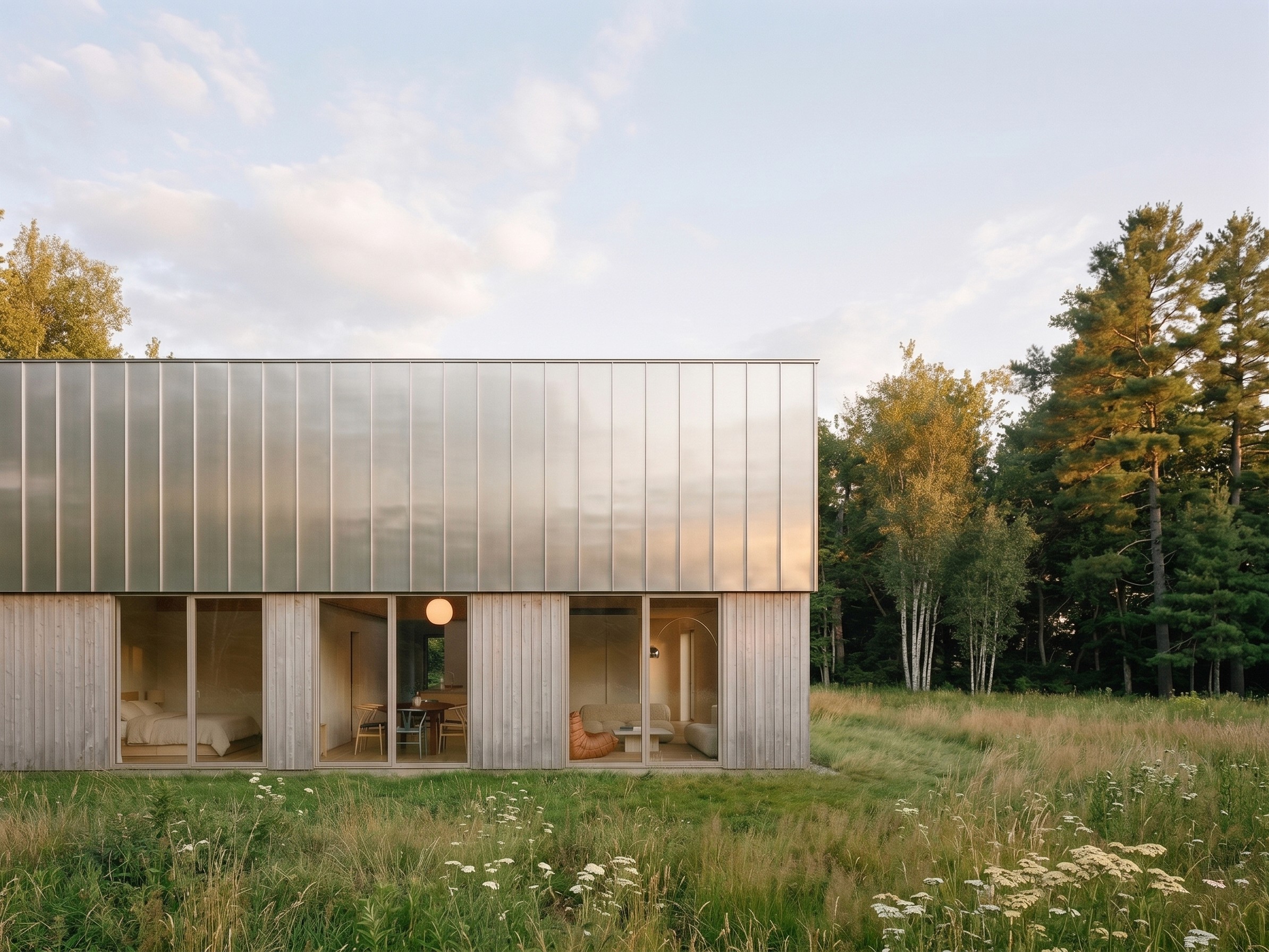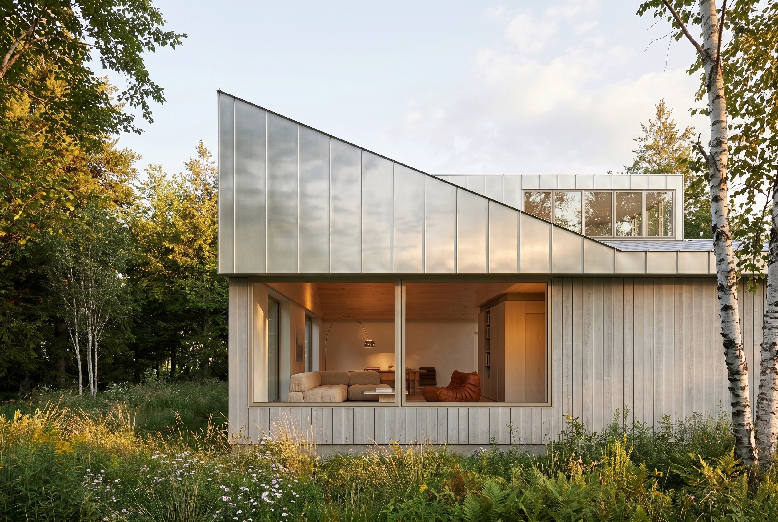 The roofline borrows from the vernacular vocabulary of American residential forms but refuses to settle into any single reading. Approached from one direction the house presents a flat roof; from another, a gable; from a third, a shed. This ambiguity is not incidental — the roof is shaped by what happens beneath it, rising over the living spaces to amplify their scale and dropping over the bedrooms to compress them into intimacy.