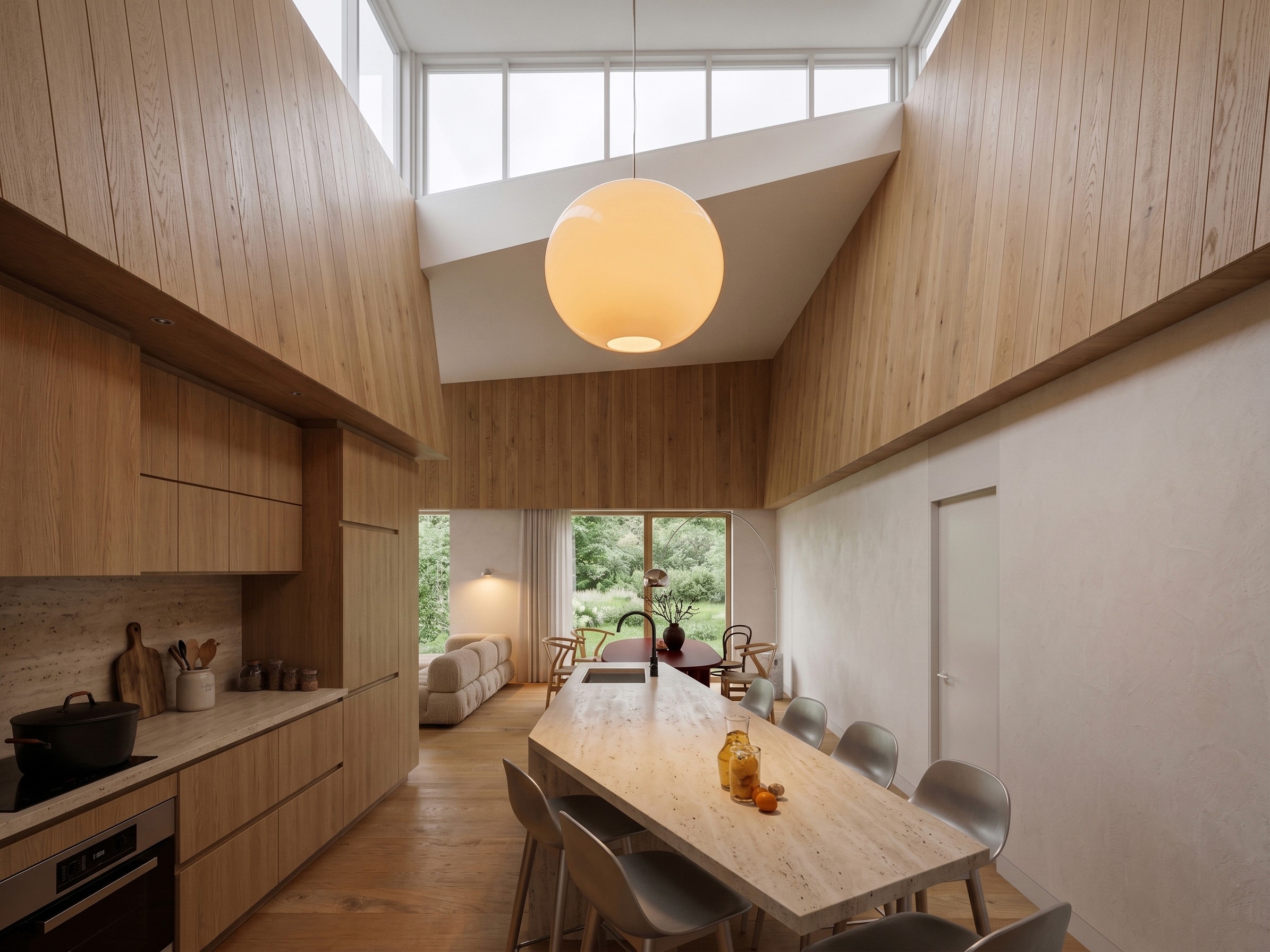 The plan is organized around a central kitchen, the spatial and social heart of the house. Dining, living, and bedrooms radiate outward from this core, each opening back toward it. Above the kitchen, a dramatic clerestory — the oculus — pulls daylight deep into the center of the plan, producing a volume that is at once domestic and almost sacral in its intensity.