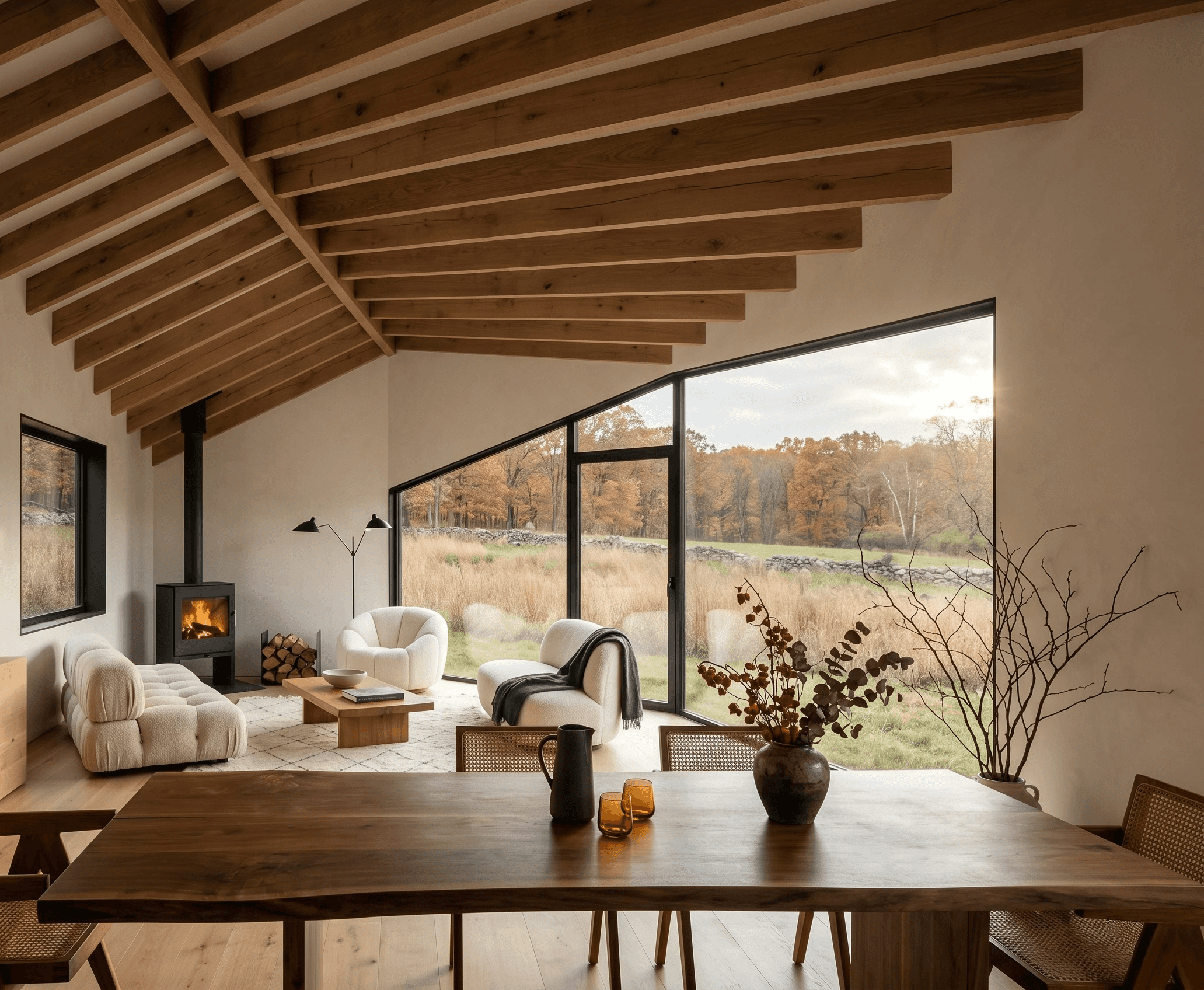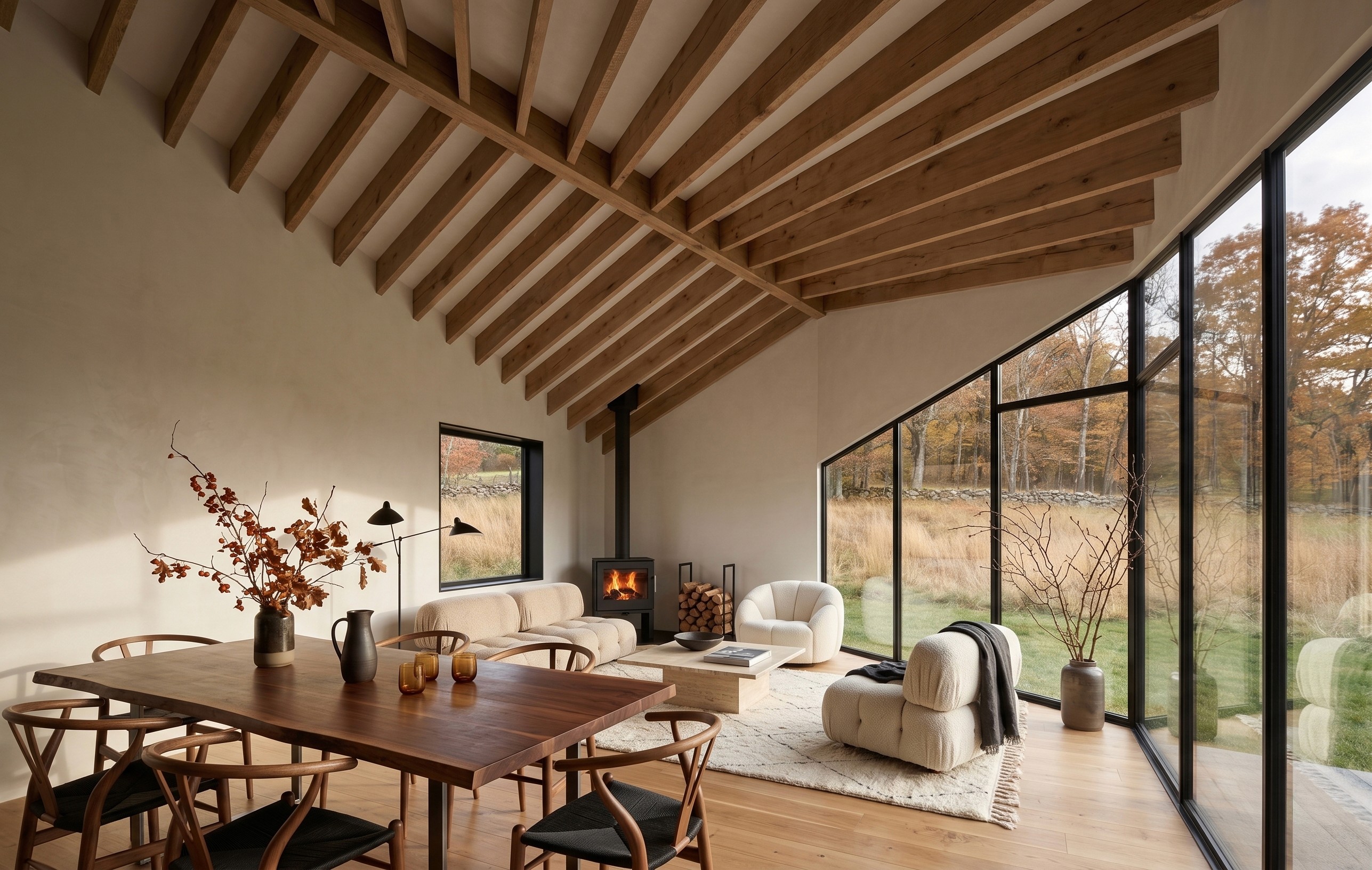 Inside, the roof folds into a polygonal geometry, and a rhythm of exposed oak rafters organizes the space overhead. Plaster walls, a wide-plank oak floor, and a blackened steel stove anchor the room in a restrained material palette. A tall picture window aligned with the patio frames the stone wall and tree line beyond, drawing the landscape into the interior as a fixed view.