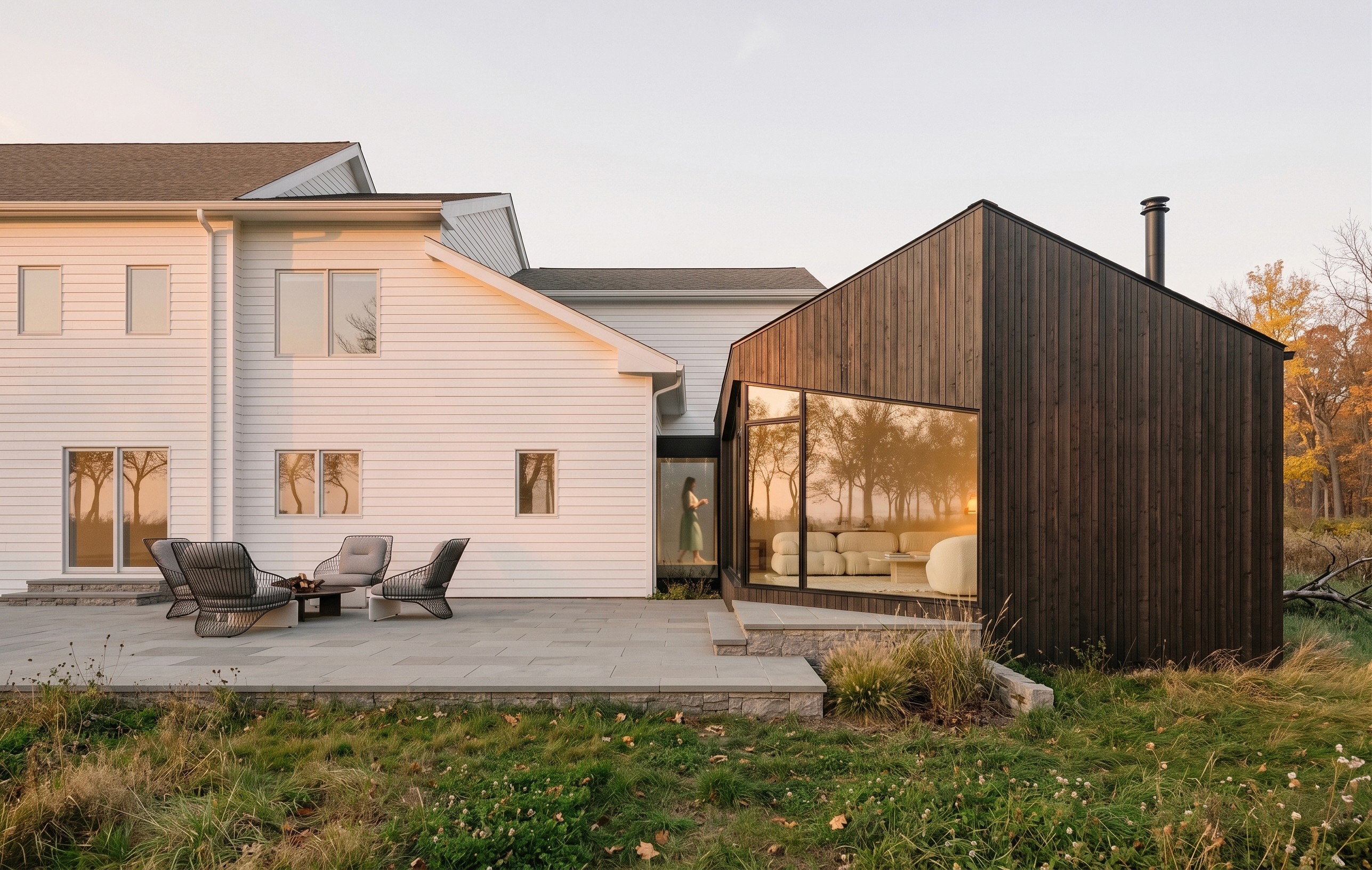 The pavilion is set in deliberate counterpoint to the host structure. Where the original house presents the familiar grammar of white clapboard, gabled roofs, and domestic pitch, the addition answers with shou sugi ban cladding, a taut asymmetric profile, and a single expansive aperture. The contrast is not polemical but compositional: two buildings in conversation across a shared threshold of stone.