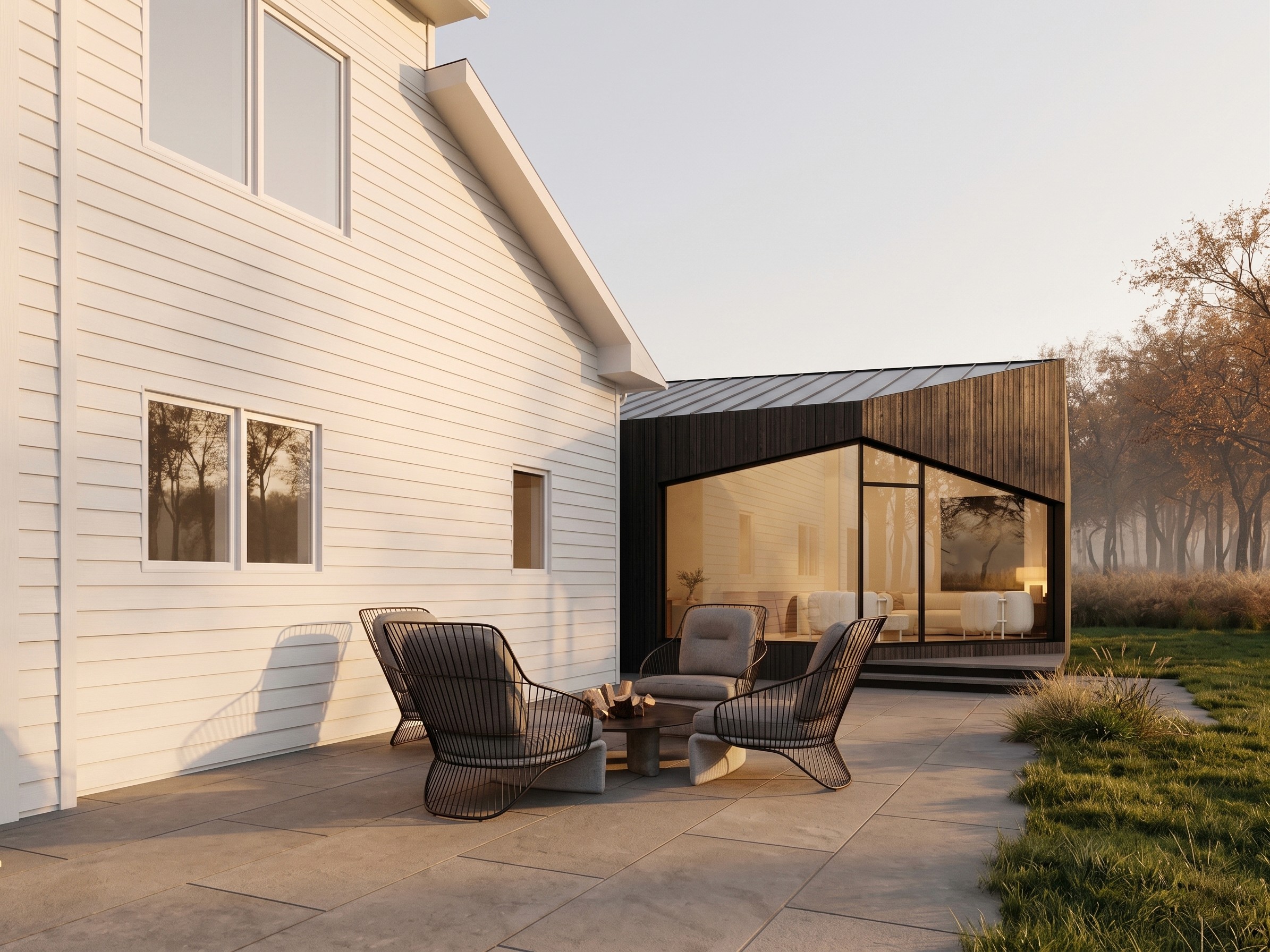 A small addition in rural Connecticut reframes the rear of a developer-built spec house as a pavilion open to the landscape. Conceived as a flexible suite for the owners, a room that adapts to reading, working, and slow gathering, the new volume extends onto an existing bluestone patio and opens it to the meadow beyond.